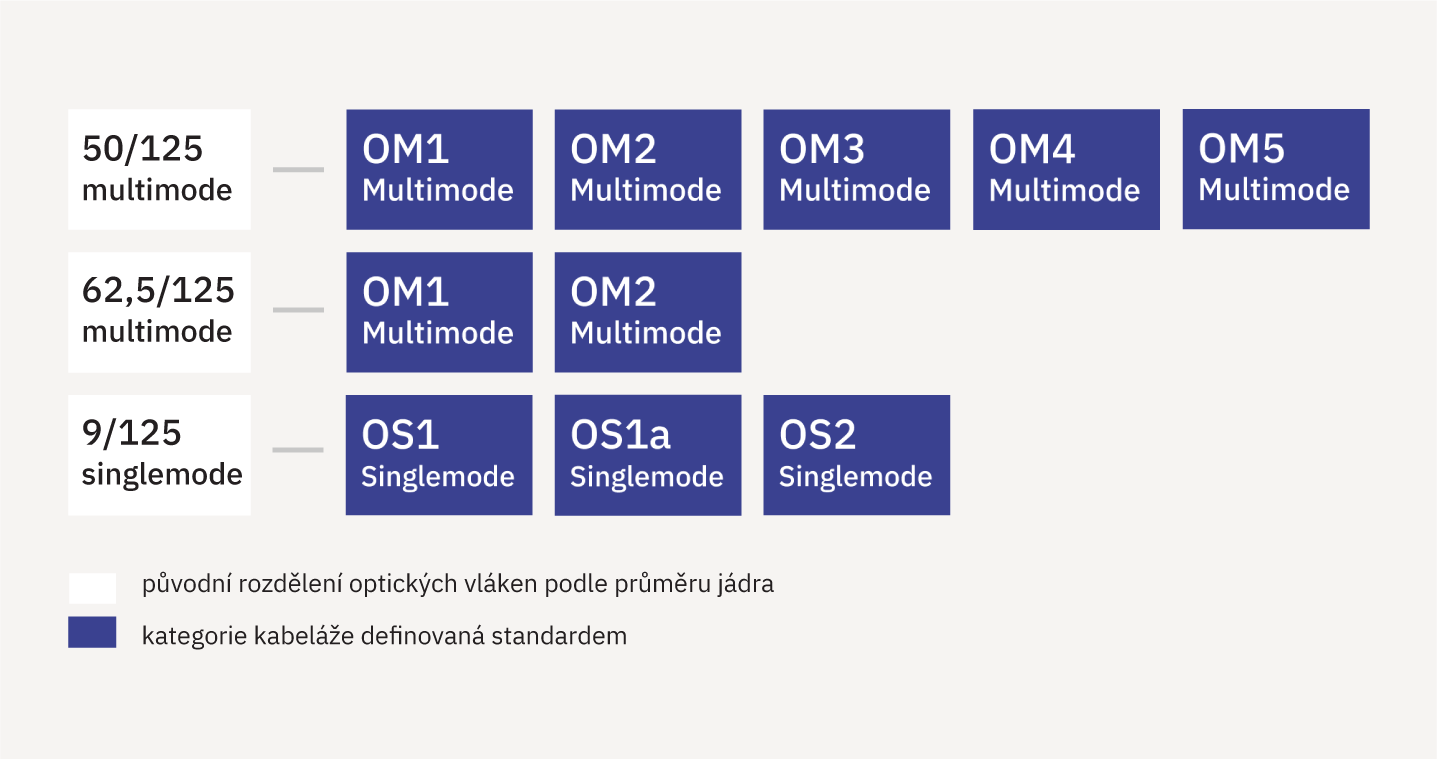 Nejnovější vysokorychlostní protokoly pro optické kabeláže si vynutily vývoj nových typů optických vláken a jim odpovídající novou kategorizaci. Původní rozdělení vláken vycházelo z průměrů optického jádra: 50/125 µm, 62,5/125 µm nebo 9/125 µm. Dnes dodávaná vlákna mají různé přenosové vlastnosti navzdory stejné geometrii jader. Mezinárodní standard proto zavedl novou kategorizaci na základě jejich výkonnostní úrovně.