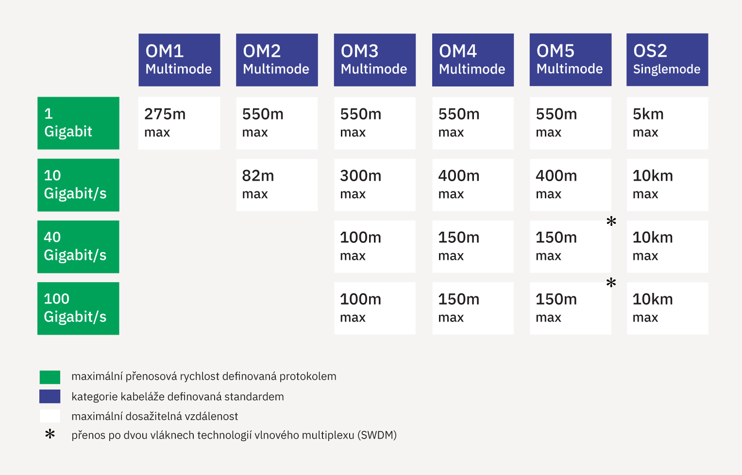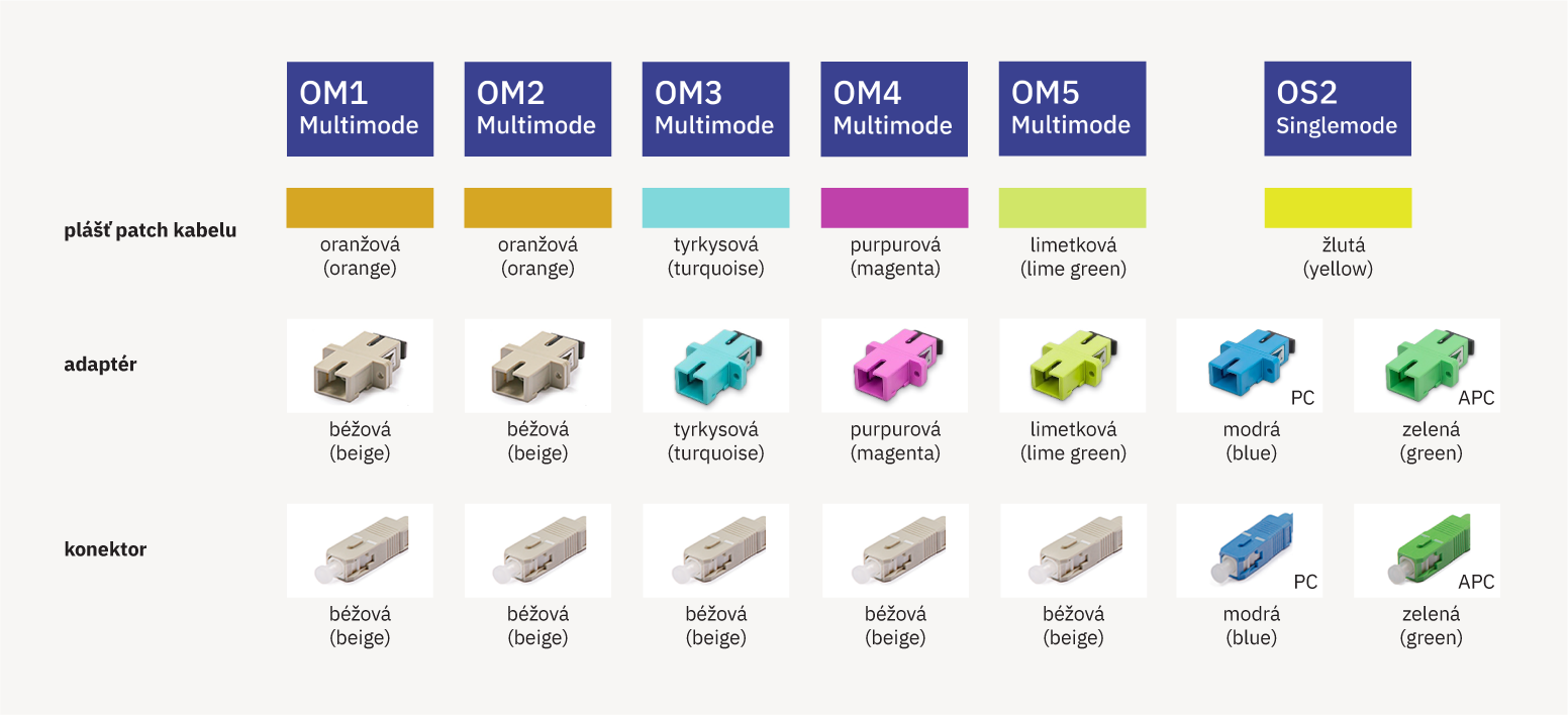 Volbu vhodného optického vlákna ulehčuje schéma sestavené pro standardizované přenosové protokoly používané v optických strukturovaných kabelážích: